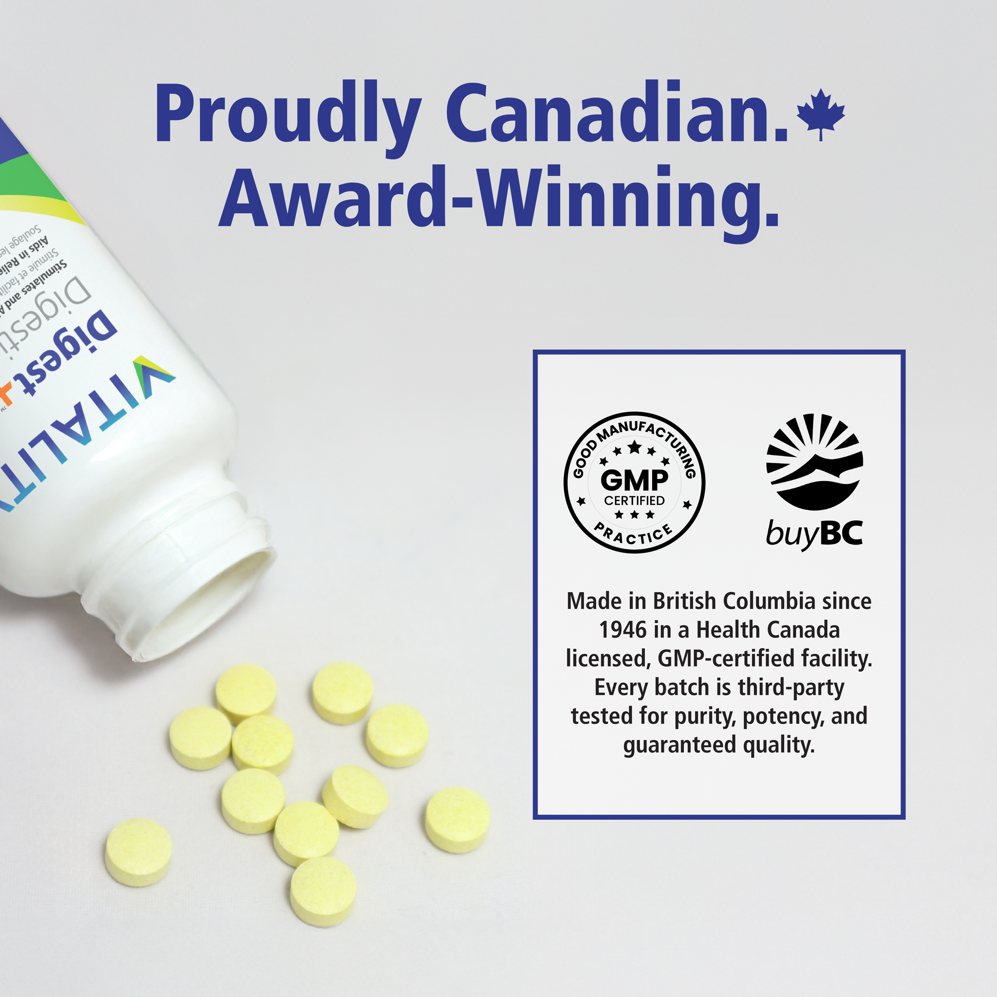 VITALITY’s Digest+ has the highest quality ingredients and is sustainably sourced. All products are processed and third party tested in Canada. Our VITALITY line is vegan friendly, gluten free, soy free, non gmo, and has no artificial flavours, colours or preservatives.