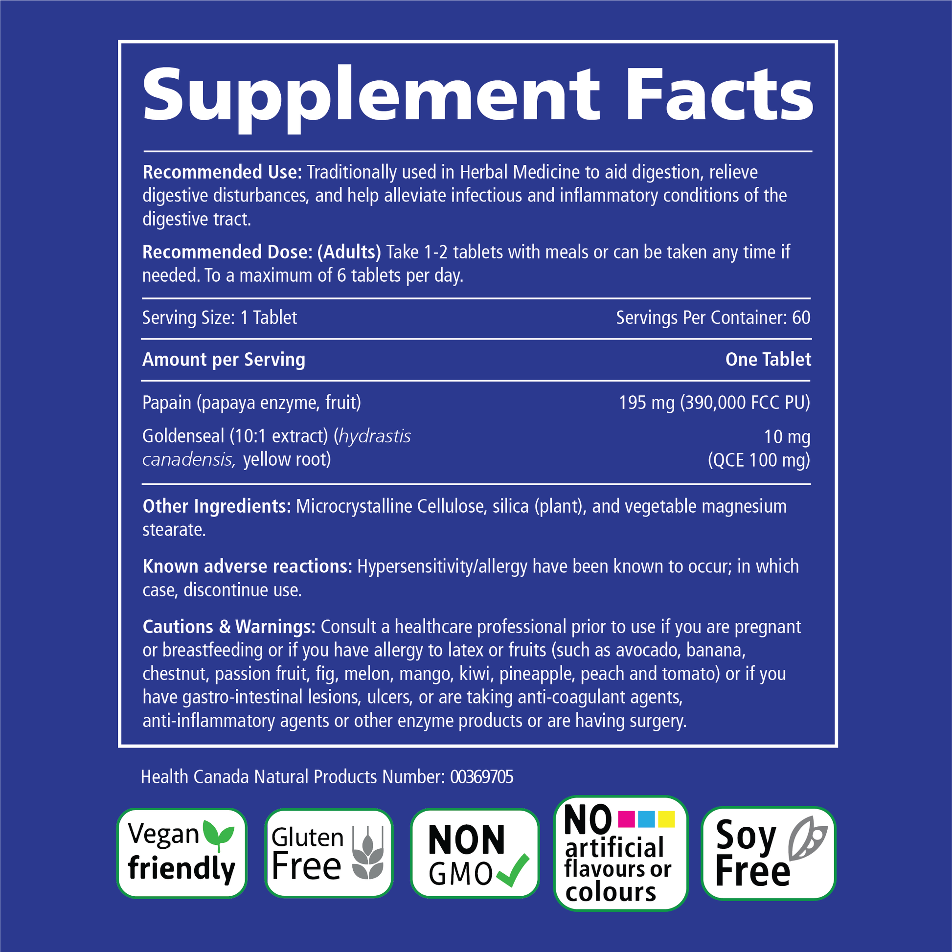 Digest+ contains goldenseal and papain. The goldenseal stimulates natural production of digestive secretions including enzymes, HCL (stomach acid) and bile. Secondly, it breaks down bad bacteria and aids in the healing of the gastrointestinal tract to reduce inflammation and absorb nutrients. Papain breaks down proteins and soothes digestive upsets.