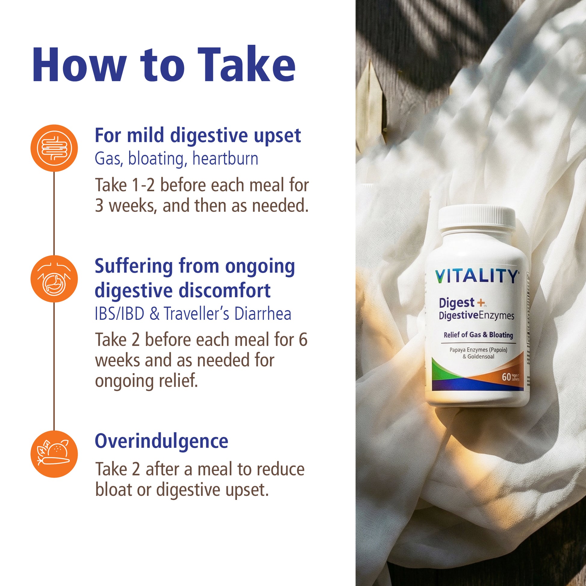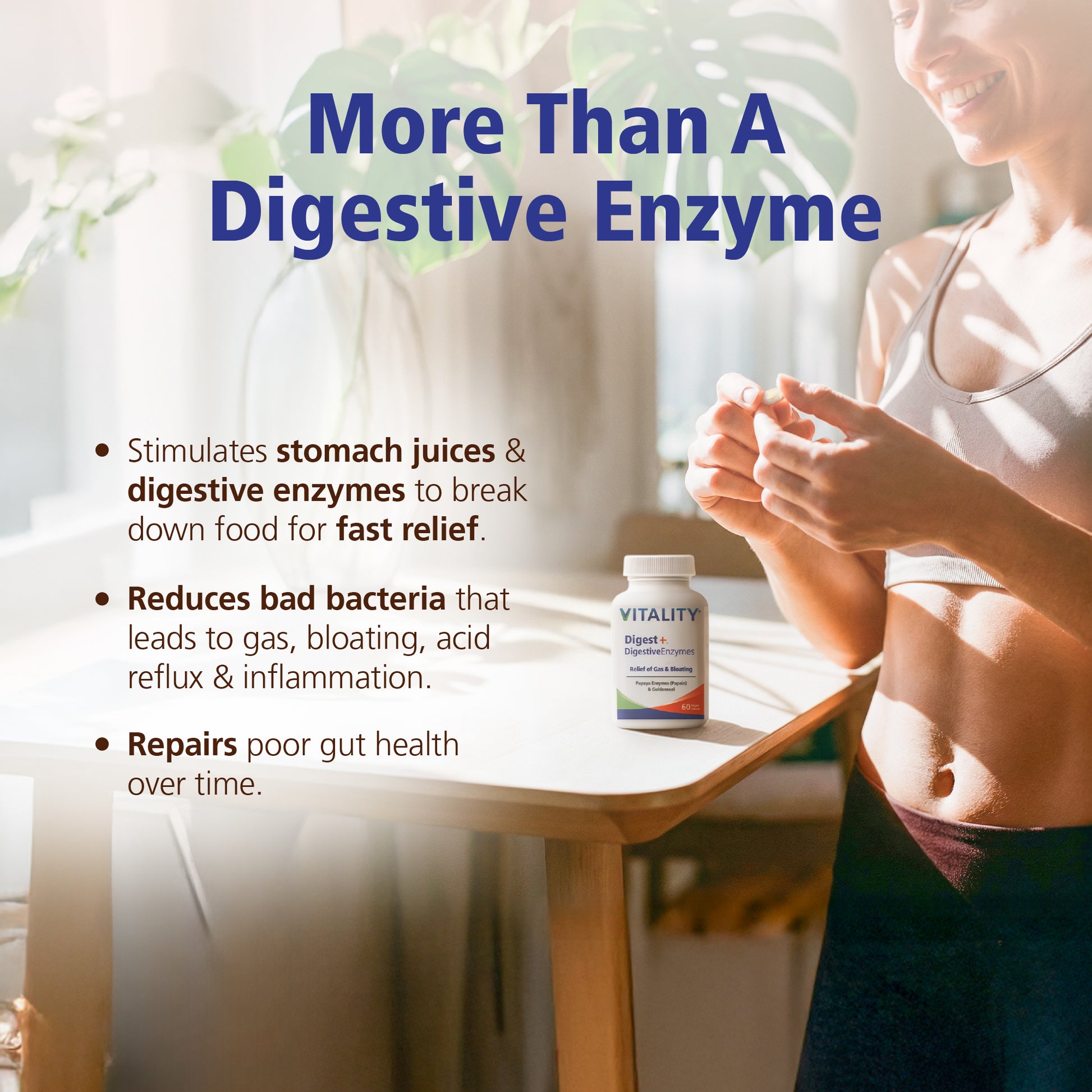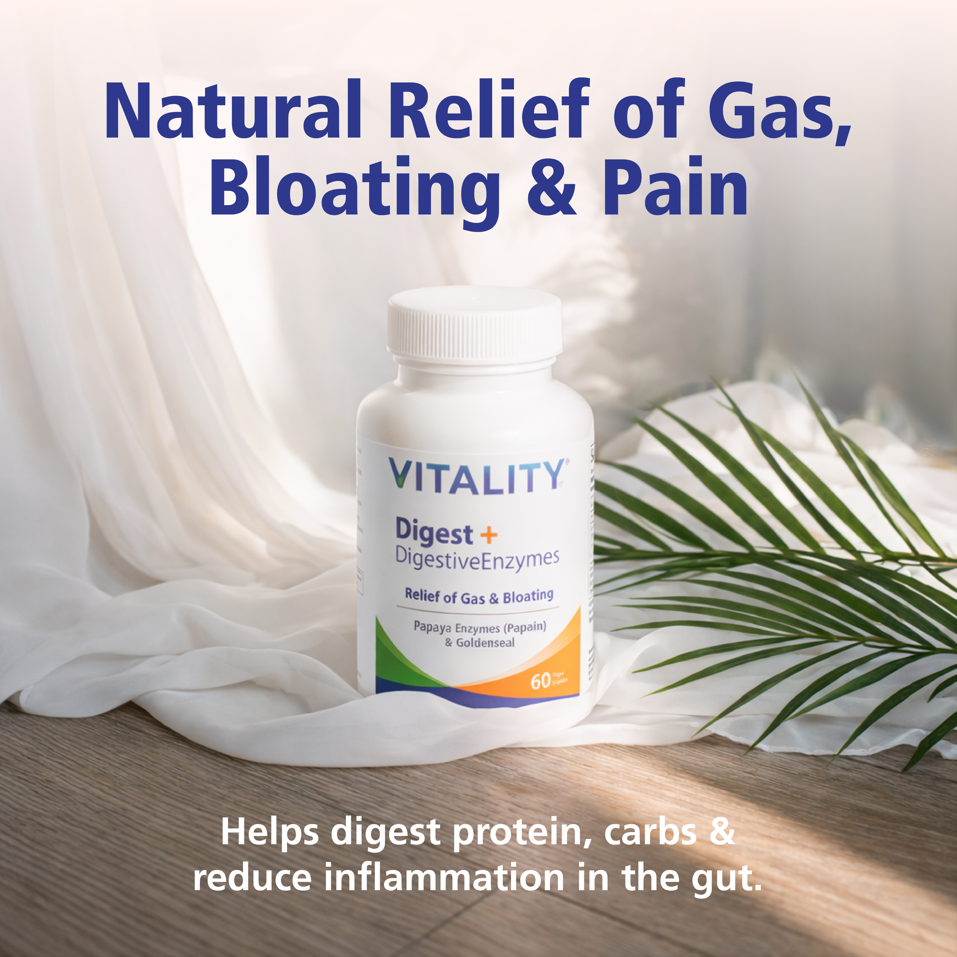 Are you suffering from digestive upset? Feel better naturally with Digest+. VITALITY targets the root causes of indigestion, bloating and stomach distress to soothe digestive upset, reduce inflammation and support the absorption of nutrients for energy.