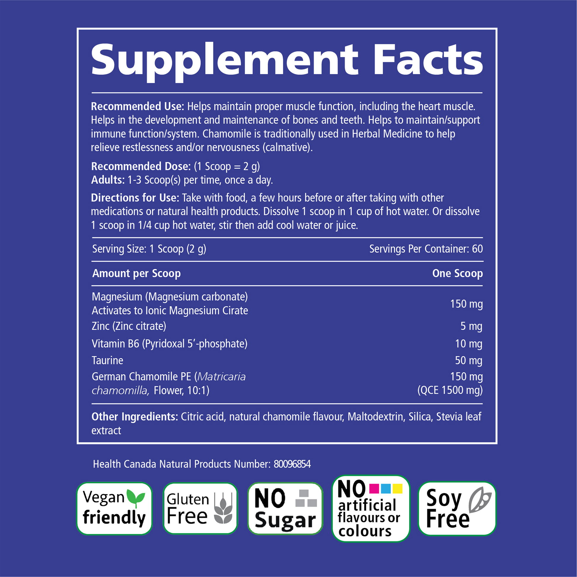 Helps to maintain the body's ability to metabolize nutrients. Helps maintain proper muscle function, including the heart muscle. Helps in the development and maintenance of bones and teeth. Helps to maintain healthy skin and connective tissue formation. Helps to maintain/support immune function/system. Chamomile is traditionally used in Herbal Medicine to help relieve restlessness and/or nervousness (calmative) and to help relieve inflammatory conditions of the gastrointestinal tract and mild digestive upset.